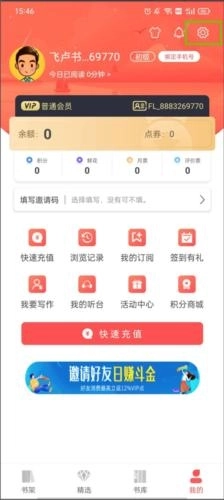 1、打开飞卢小说,选择下方菜单栏【我的】,点击右上角的齿轮图标。