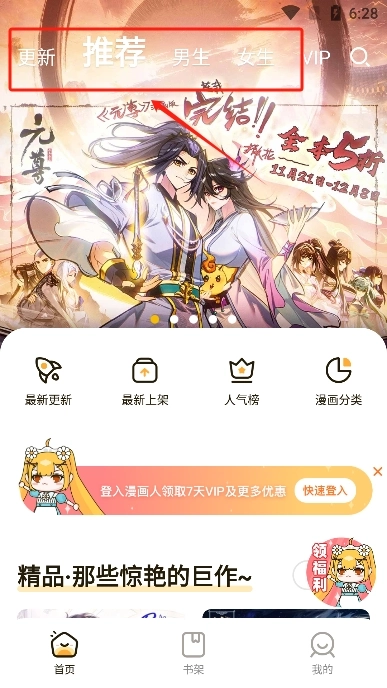 1、这里有超多漫画推荐阅读,包括男频、女频的分类可以快速找到感兴趣的漫画