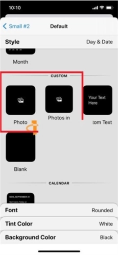 您需要做出的第一个选择,是希望主屏幕上的窗口小部件呈现哪类信息。以下是Widgetsmith提供的可选用数据源:时间、日期、自定义内容(包括照片、相册中的照片、自定义文本、空白样式)、日历、提醒事项、天气、健康与活动数据以及天文学相关信息。