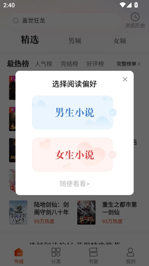 1、选择阅读偏好,软件为你推荐更加适合你的小说。