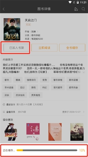 5、系统这时候就会开始缓存小说,同时该本小说也是加入到了我们的书架中;