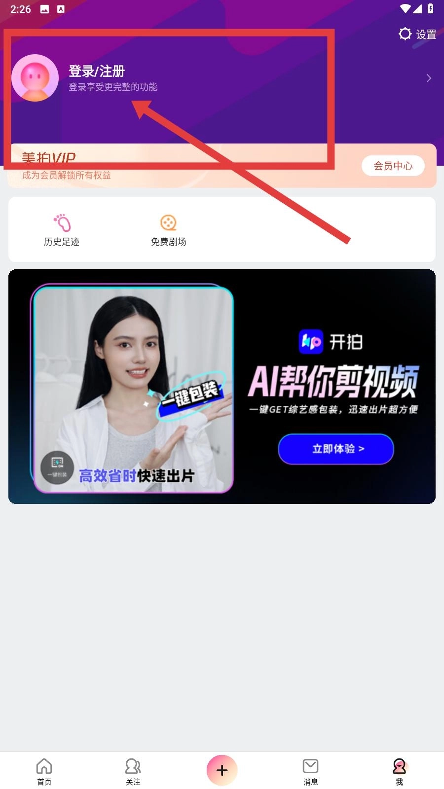 3、进入个人中心页面后,点击登录或注册区域,按指引选择登录方式,完成登录或注册操作,登录后可使用美拍的发布作品、互动等功能。