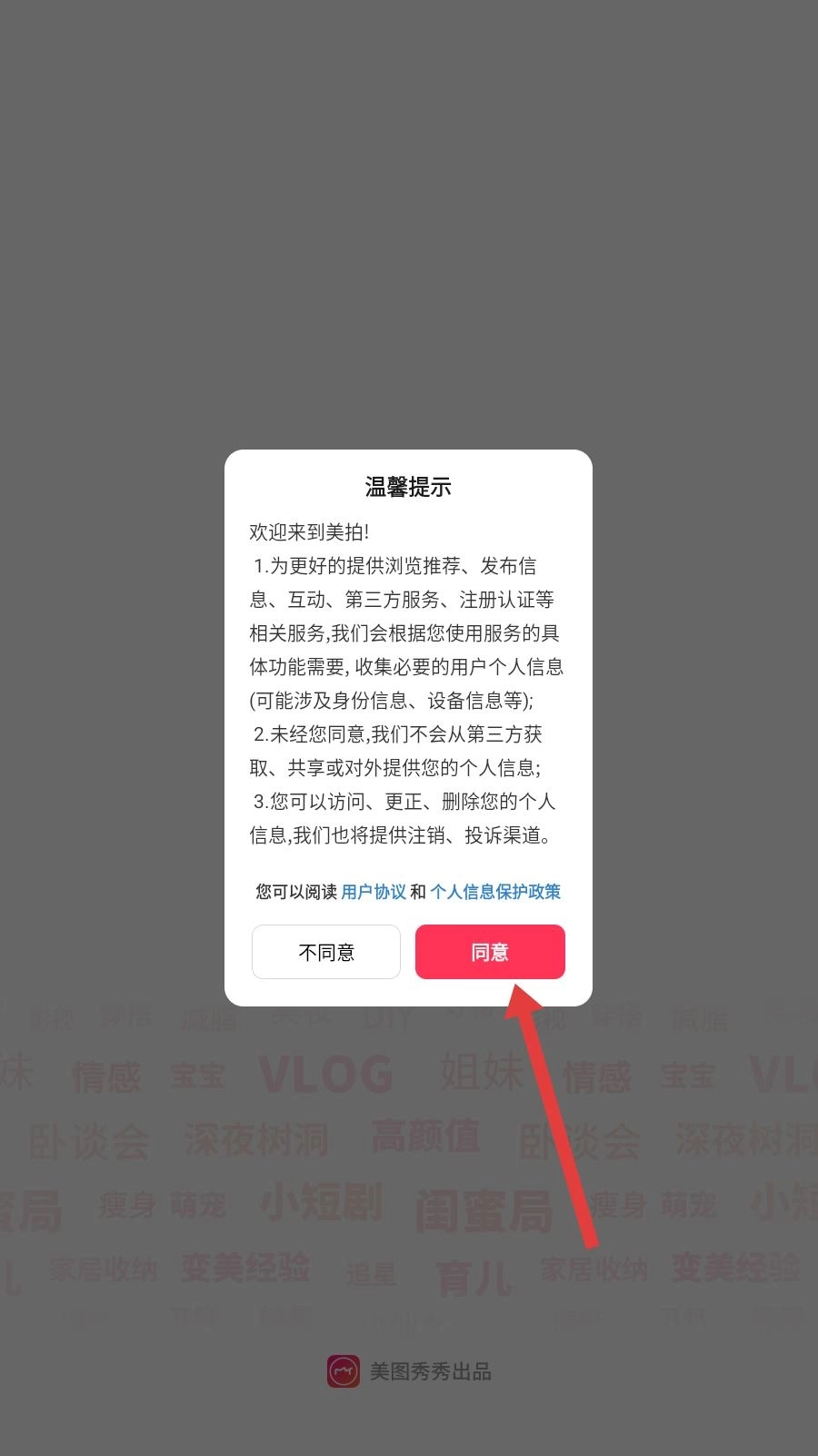 1、打开美拍应用,弹出温馨提示弹窗,仔细阅读用户协议和个人信息保护政策内容,点击同意按钮,进入应用主界面。
