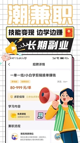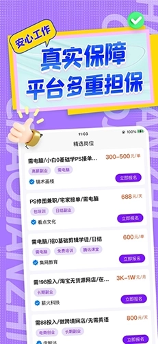 -专业可靠:无需担忧雇主拖欠兼职报酬,平台确保用户的线上薪资能准时、顺畅地发放到账。