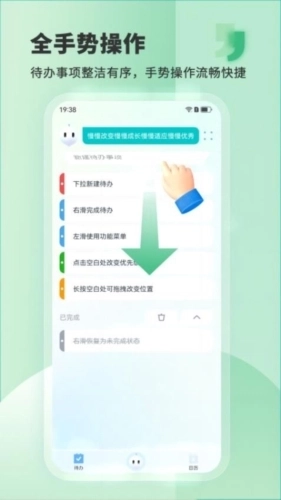 全手势操作功能支持用户通过手势操作新建待办事项,也可通过手势调出功能菜单使用相关功能。