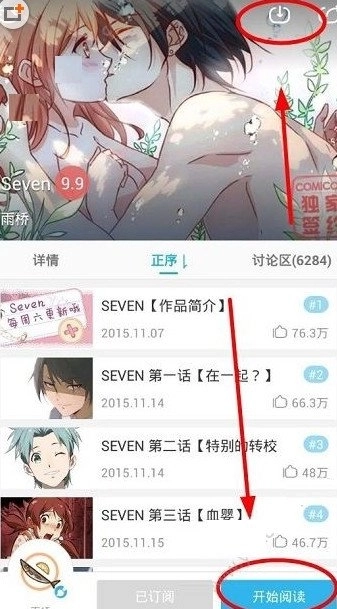 进入“seven漫画”阅读界面,点击“开始阅读”,可以在线阅读漫画;点击“按钮图标”,进入缓存页面;