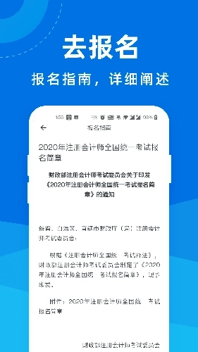 在“考试介绍”板块中,对注册会计师考试的重要价值与备考难度进行了细致说明,同时清晰列出各考试科目及对应的核心知识点,助力用户全面且清晰地掌握整个考试体系的架构。“报名指南”部分则针对报名流程与报考条件展开了详尽解读,旨在让每位考生都能顺利完成报名、参与考试,避免因对规则的不熟悉而错失考试机会。“考试讲台”专区集中整合了招考动态、报考通知等关键公告信息,确保用户能够及时获取所有重要内容,不错过任何关键节点。“实时资讯”板块会持续更新注册会计师考试相关的各类最新动态,帮助用户在考试政策或信息变化时能够快速调整应对策略,进而提升备考及考试的成功率。