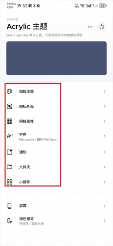 5、在主题页面内你可以自行编辑主题、图标外观、字体、小部件的功能