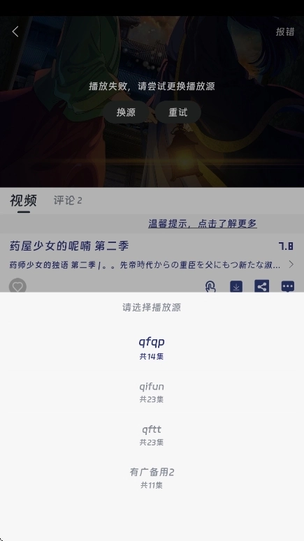 2、如图,点击"换源",即可看到多个可用的播放源。