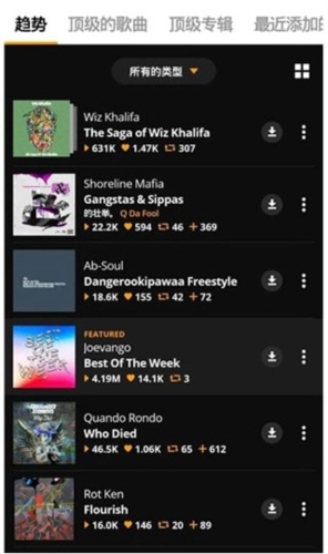 1、在本站打开软件后,能看到几个主要栏目,像趋势、热门歌曲、热门专辑之类的都包含在内;