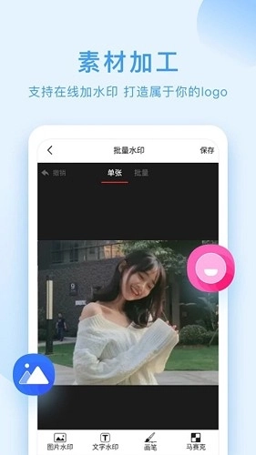 4,寿材加工支持在线添加水印,可打造专属独特LOGO,支持批量处理图片水印、文字水印,还具备画笔添加功能及马赛克隐私保护功能。