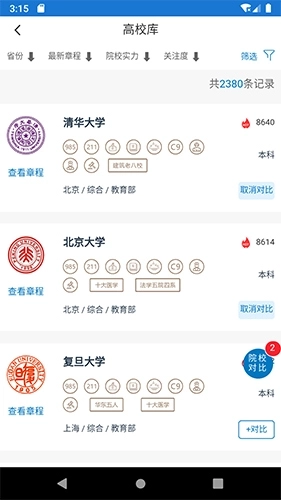 [院校大全]涵盖全国2700多所大学的录取分数线、招生计划、师资力量、奖学金等各类信息