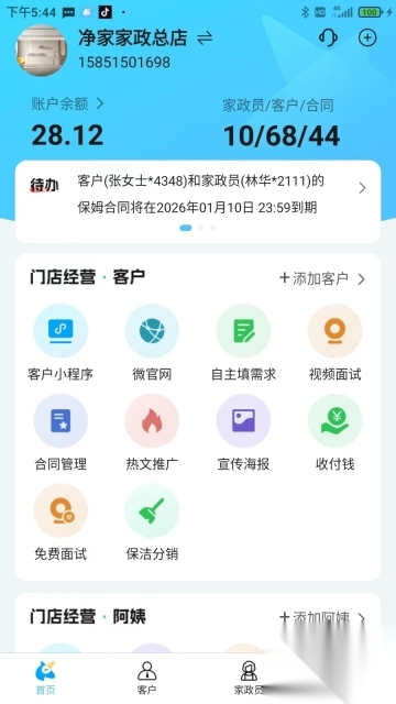1、登录首页即可直观查看账户余额,同时还能清晰了解当前在职家政人员数量、客户数量以及已签订的合同总数;此外,平台还配备了支持视频或语音形式的阿姨面试功能,各项功能设置得十分完备。