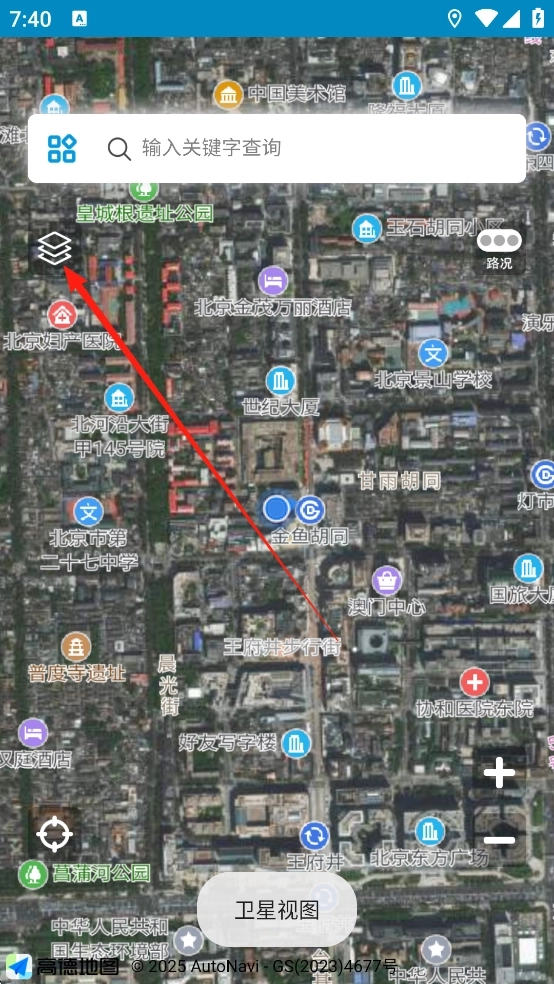 3、点击地图模式选项,可切换到卫星影像视图,查看真实的地形和建筑布局