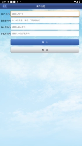 3、在【注册】页面依次填写用户名、登录密码、确认密码和手机号,随后点击【确认】按钮,即可完成注册操作。