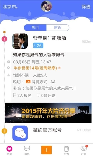 在微约,这些都能为你办妥——发起约会、参与约会、探寻附近的人,找到能与你相伴的那个TA。
