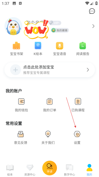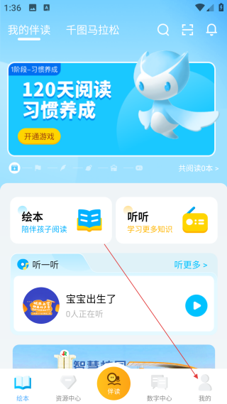 1、打开伴读应用后,在首页点击底部导航栏中的【我的】选项,即可进入个人中心的功能界面。