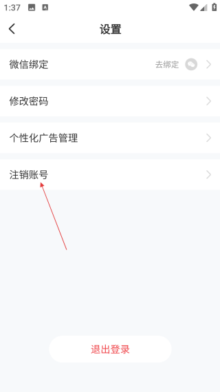 3、进入设置页面后,点击【注销账号】选项,即可跳转至账号注销的验证信息填写页面。