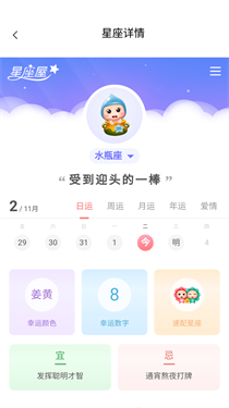 1、麻小雀日历的星座详情功能涵盖幸运颜色、幸运数字、速配星座等内容。