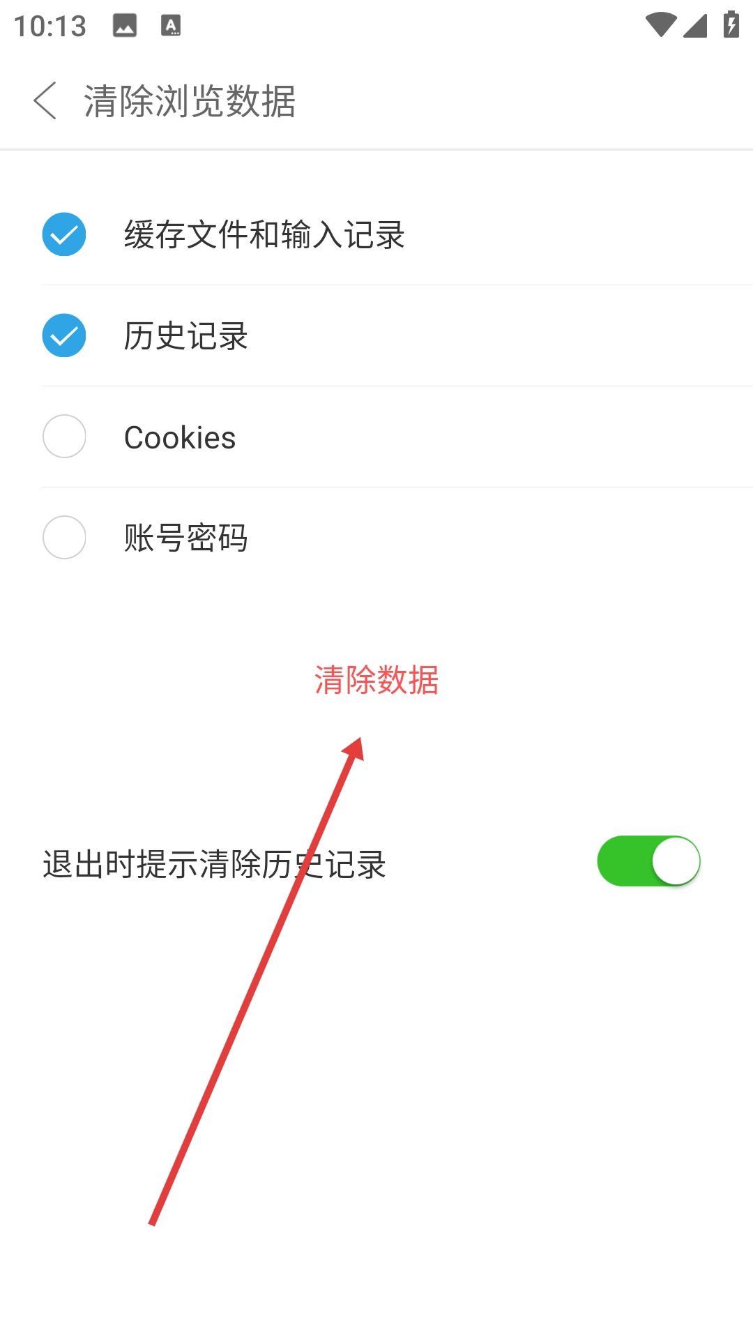 在清除浏览数据的页面中点击【清除数据】按钮,即可完成浏览数据的清除操作。