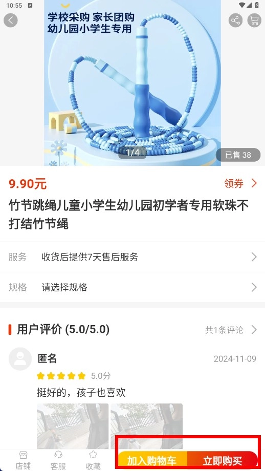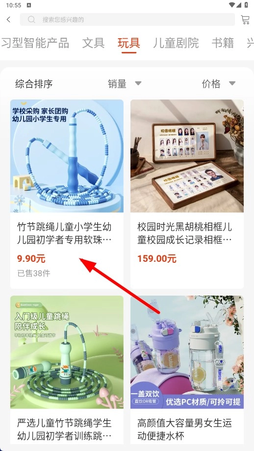 在玩具商品列表中,点击【竹节跳绳】的商品卡片,即可查看该商品的详情。