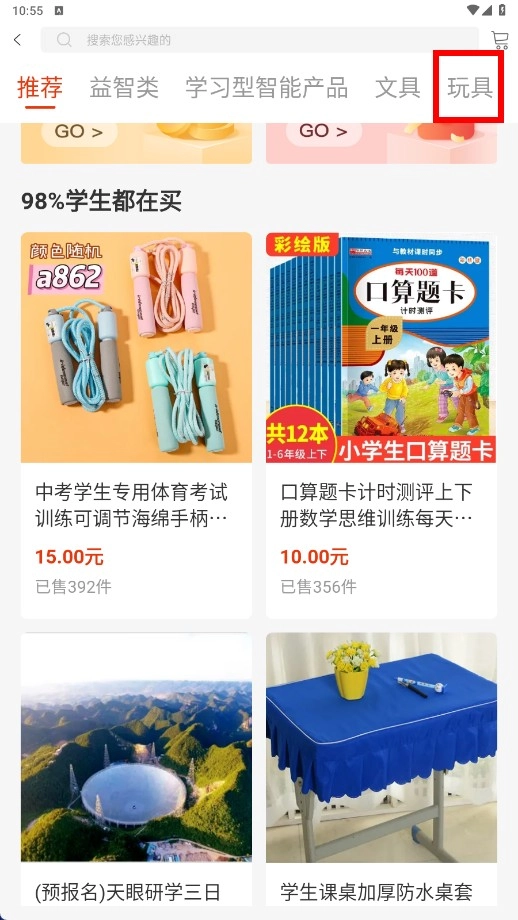 在页面上找到【玩具-分类标签】并点击,即可查看玩具类商品。