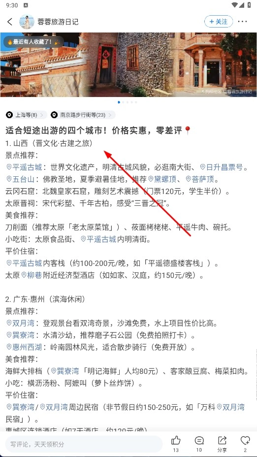 进入攻略详情页面,就能查看【山西-晋文化古建之旅-景点推荐】之类的内容。
