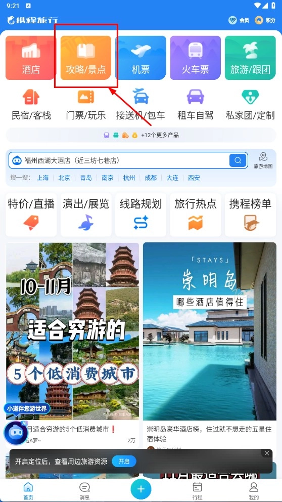 点击【攻略/景点】功能按钮,即可进入旅游攻略页面。
