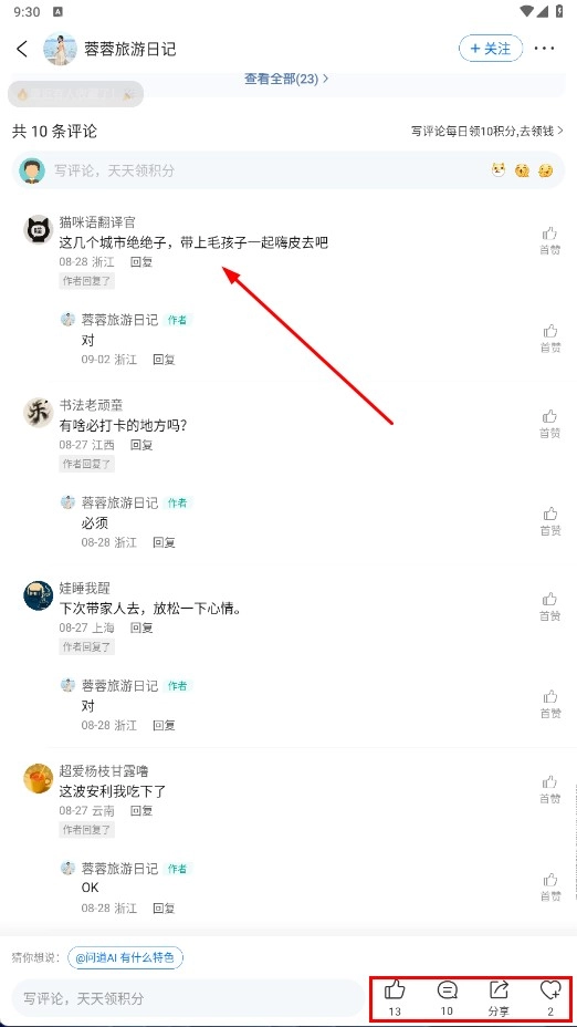 在攻略的评论区里,你可以浏览其他用户的评论内容,也能点击点赞、评论、分享之类的按钮来进行互动。