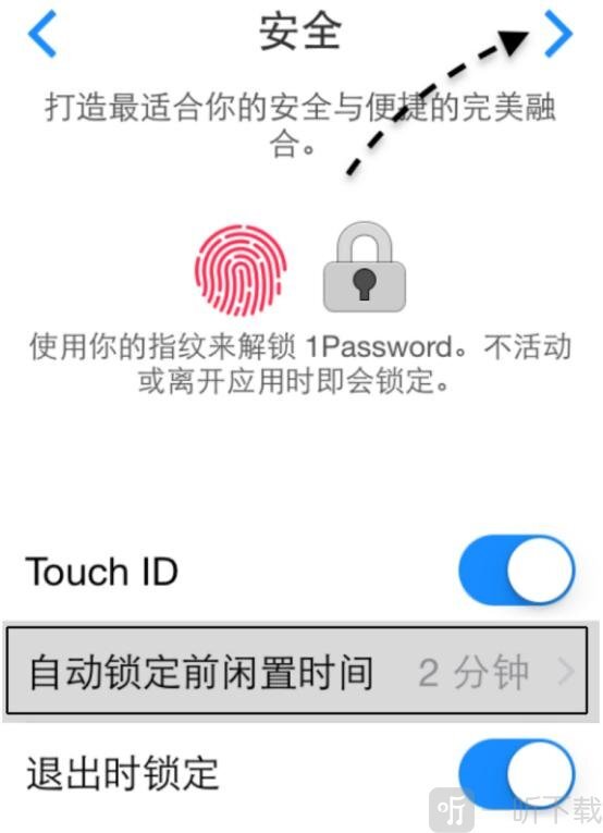 3、进入1password的“安全”设置页面,在此处能够设置指纹识别功能。另外,可依据个人实际情况,设定自动锁定的时间,比如将其设置为2分钟,同时开启“退出时锁定”选项。