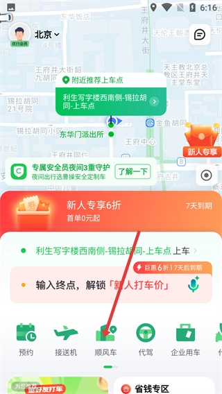 在打车软件的主界面上,找到并点击【顺风车】这个选项,这样就能进入到顺风车的功能界面了。