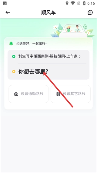 在顺风车界面,点击“你想去哪里?”输入框,即可进入目的地输入界面。
