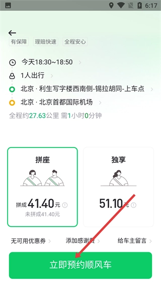 在选定拼座或独享的车型后,点击【立即预约顺风车】按钮,即可提交顺风车的预约申请。