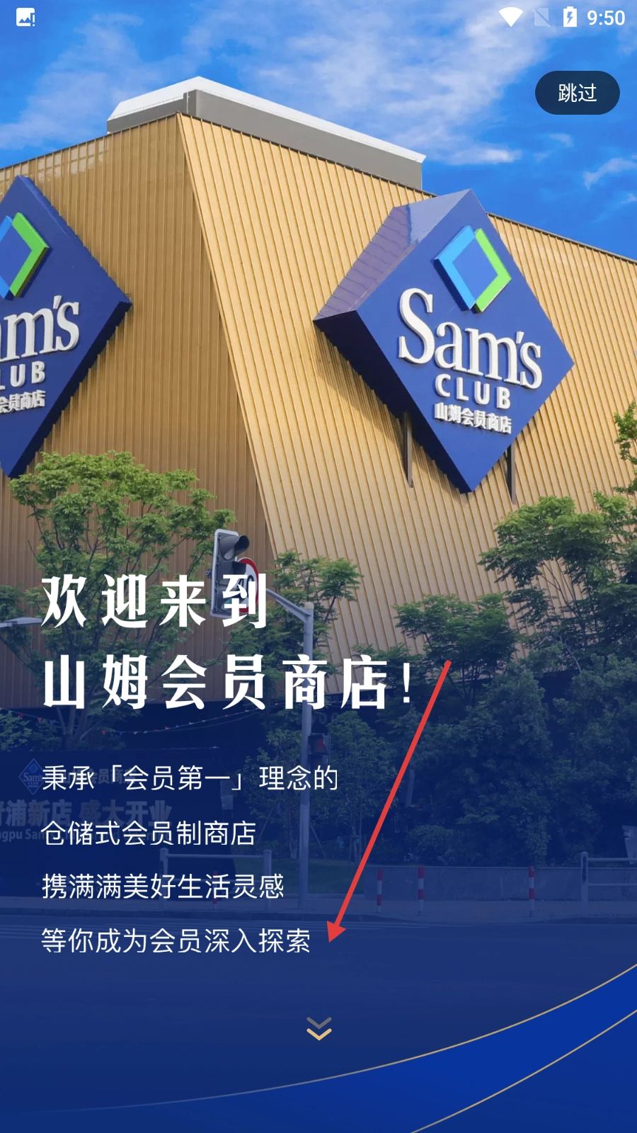 进入山姆会员商店后,首先映入眼帘的是欢迎界面,你可以点击界面下方的箭头来继续后续操作,也能点击右上角的【跳过】按钮直接进入下一步。