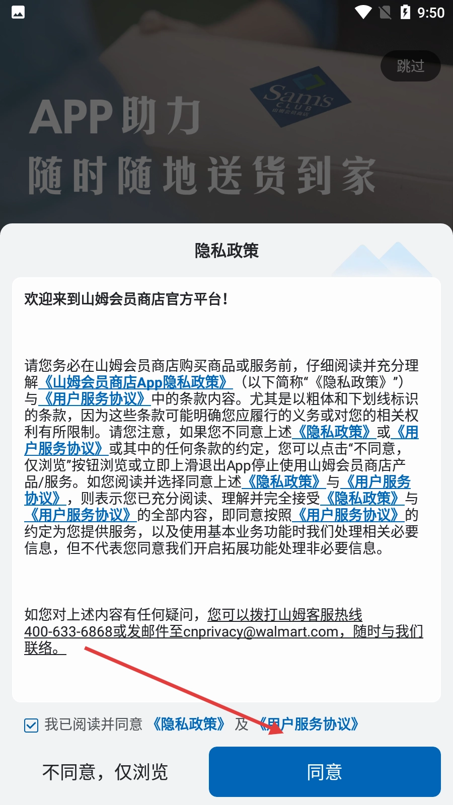 在隐私政策页面,勾选“我已阅读并同意《隐私政策》与《用户服务协议》”这一选项后,点击“同意”按钮即可。