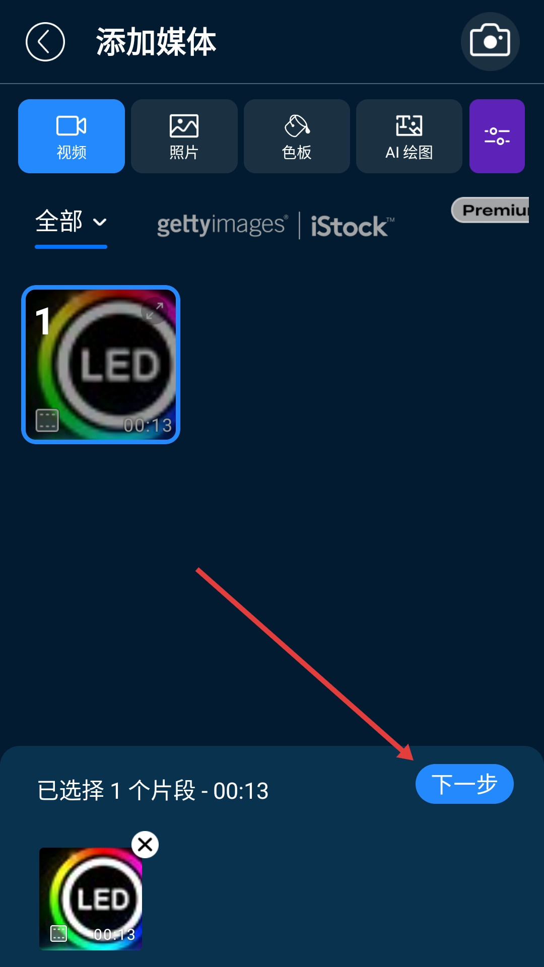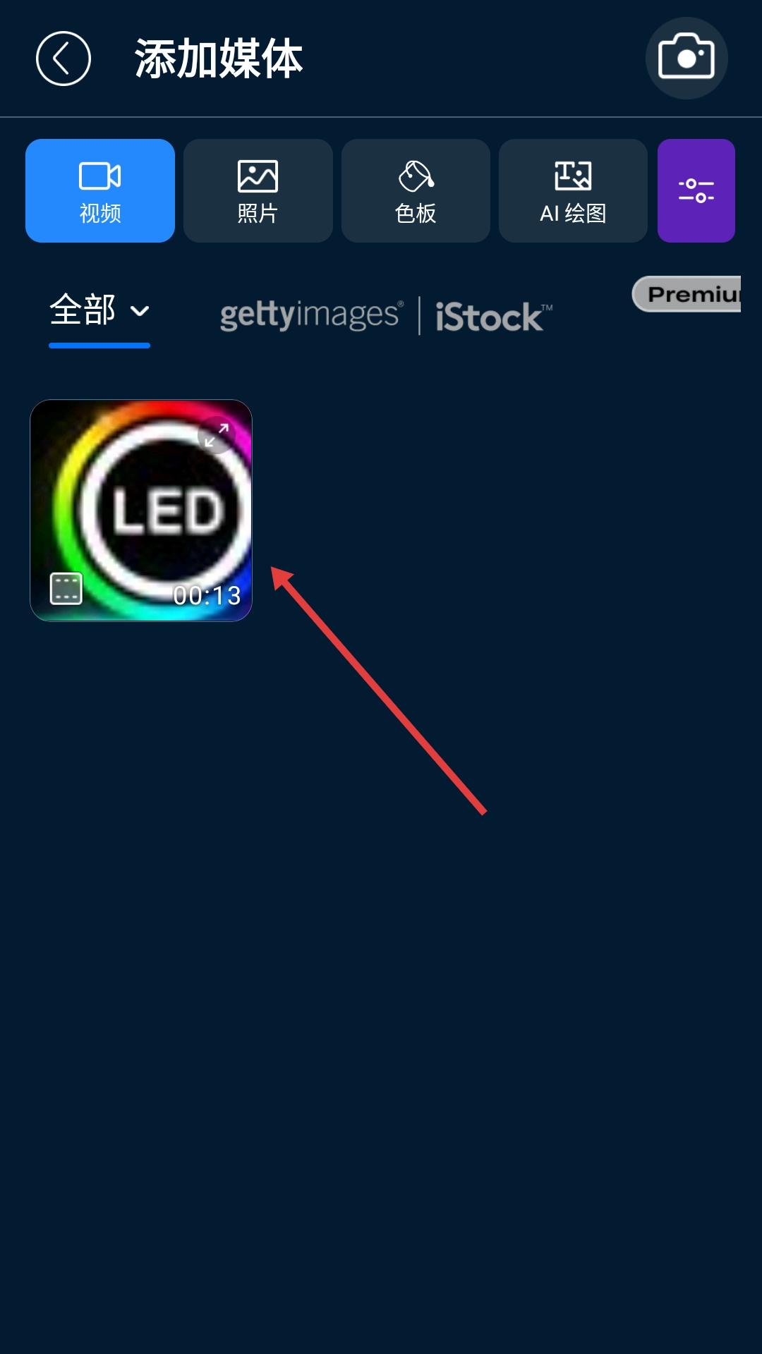 在添加媒体的页面里挑选目标视频素材,比如带有“LED”标识的视频。