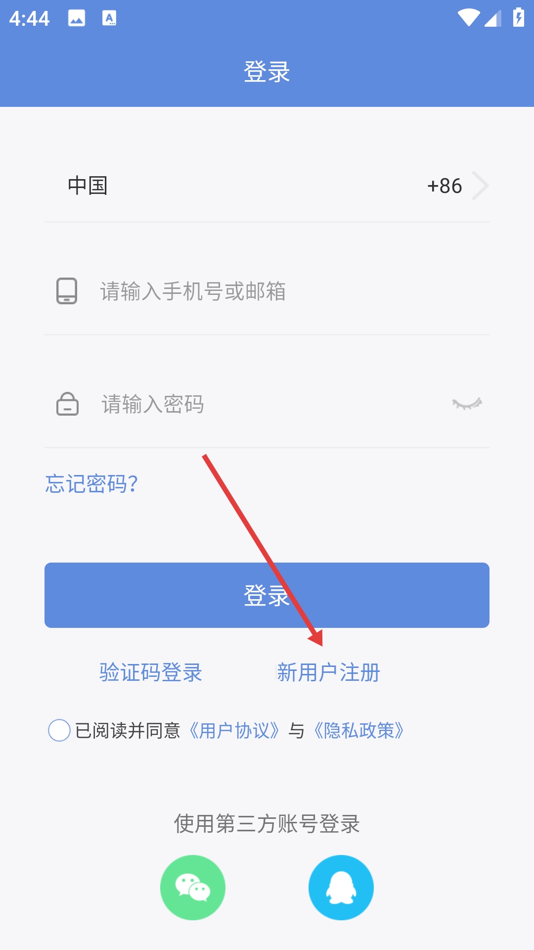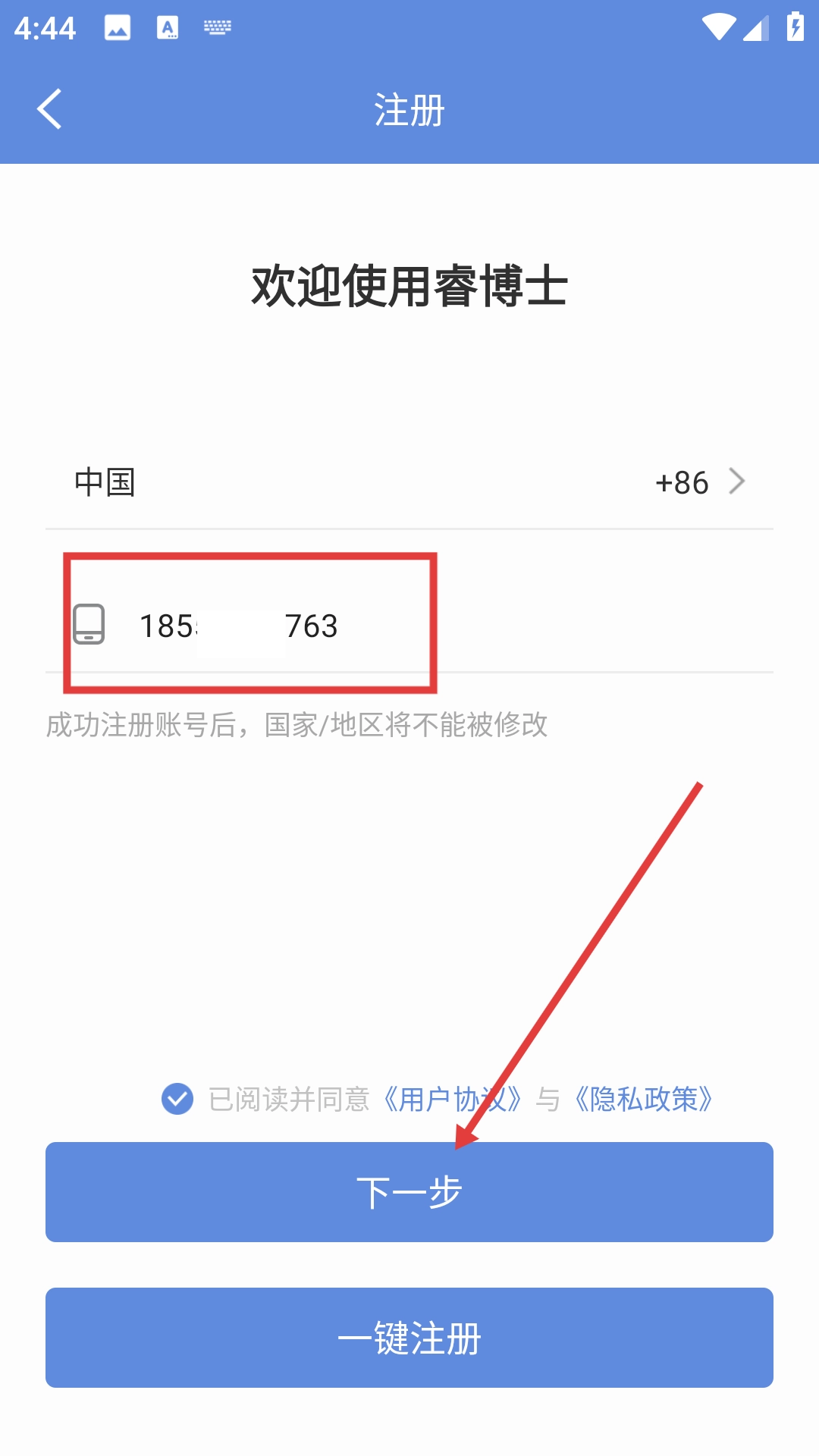 在注册页面的手机号输入框中填写目标手机号,勾选“已阅读并同意相关协议”选项,然后点击【下一步】按钮。
