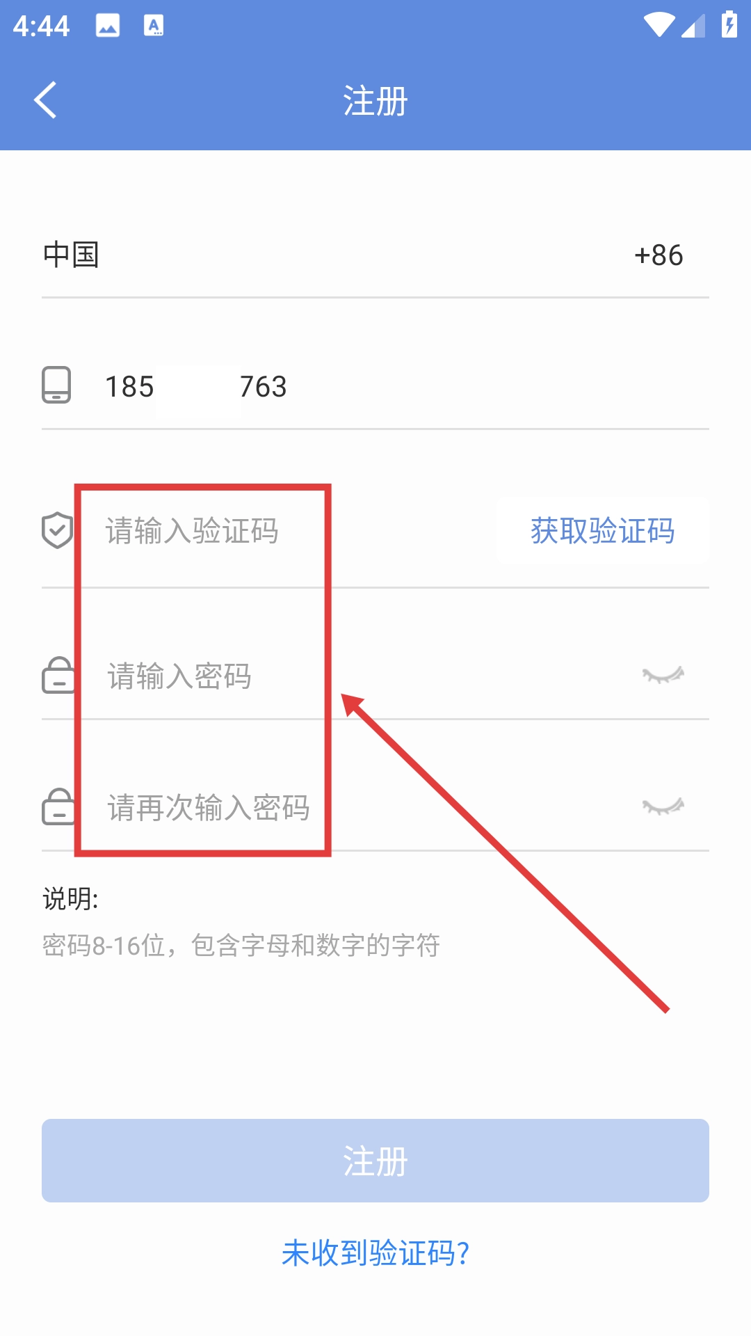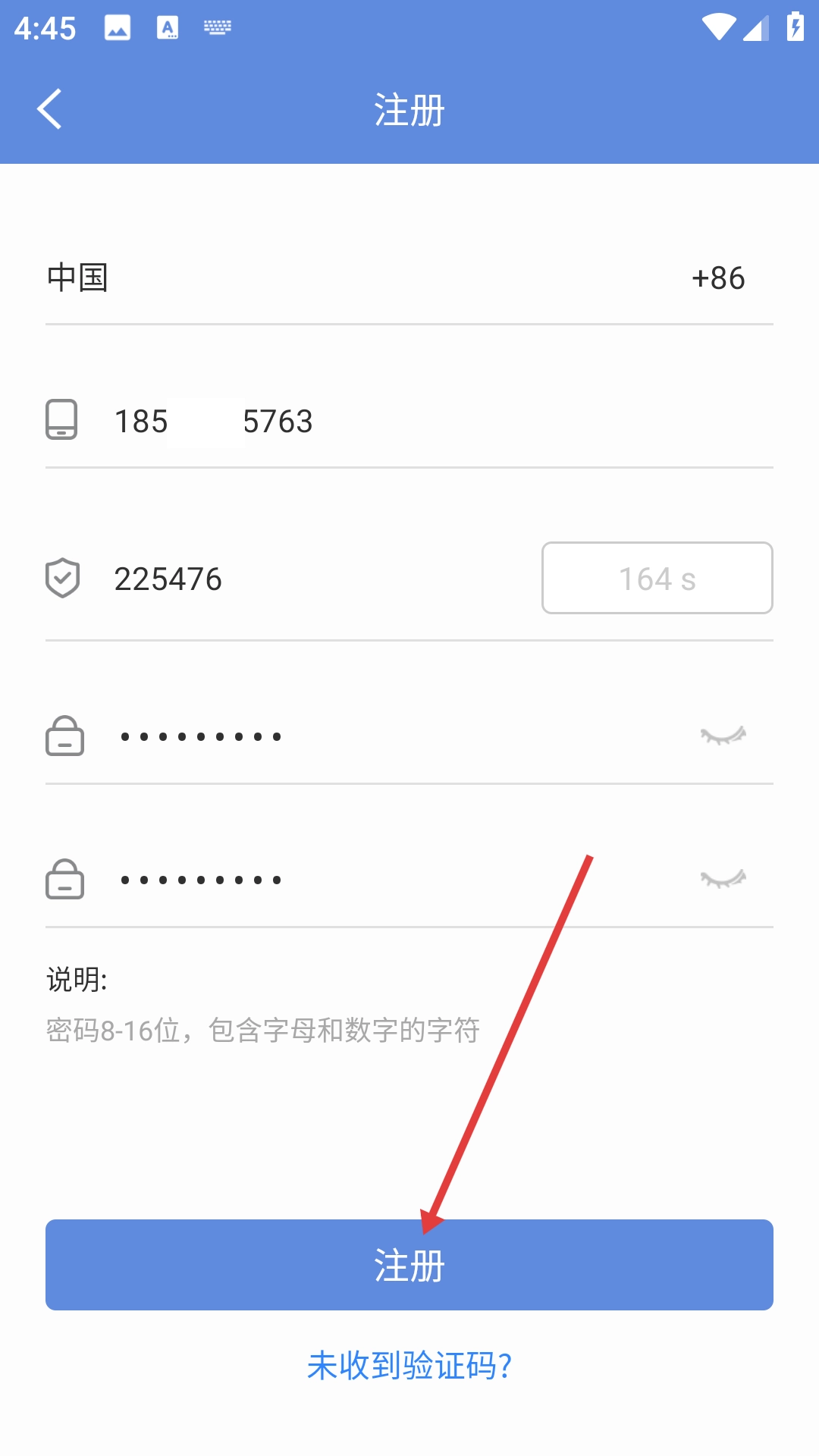 接下来的页面里,请输入收到的验证码,接着设置密码(要求长度在8到16位之间,且必须同时包含字母和数字),最后再次输入密码进行确认。