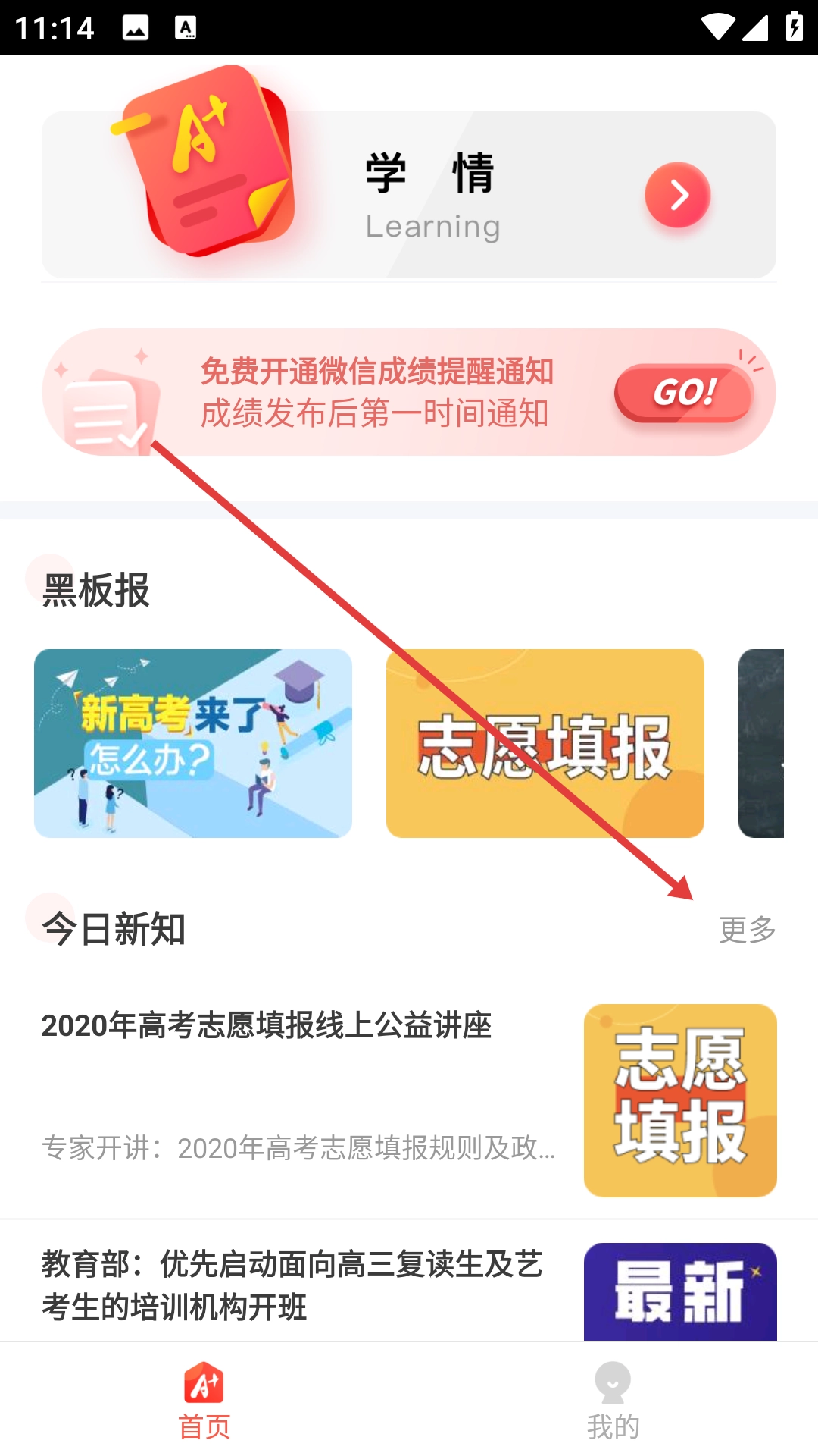点击“今日新知”右侧的“更多”按钮,即可进入A佳教育快讯页面,在该页面能查看教育政策、招生资讯等经过精选的新知内容。