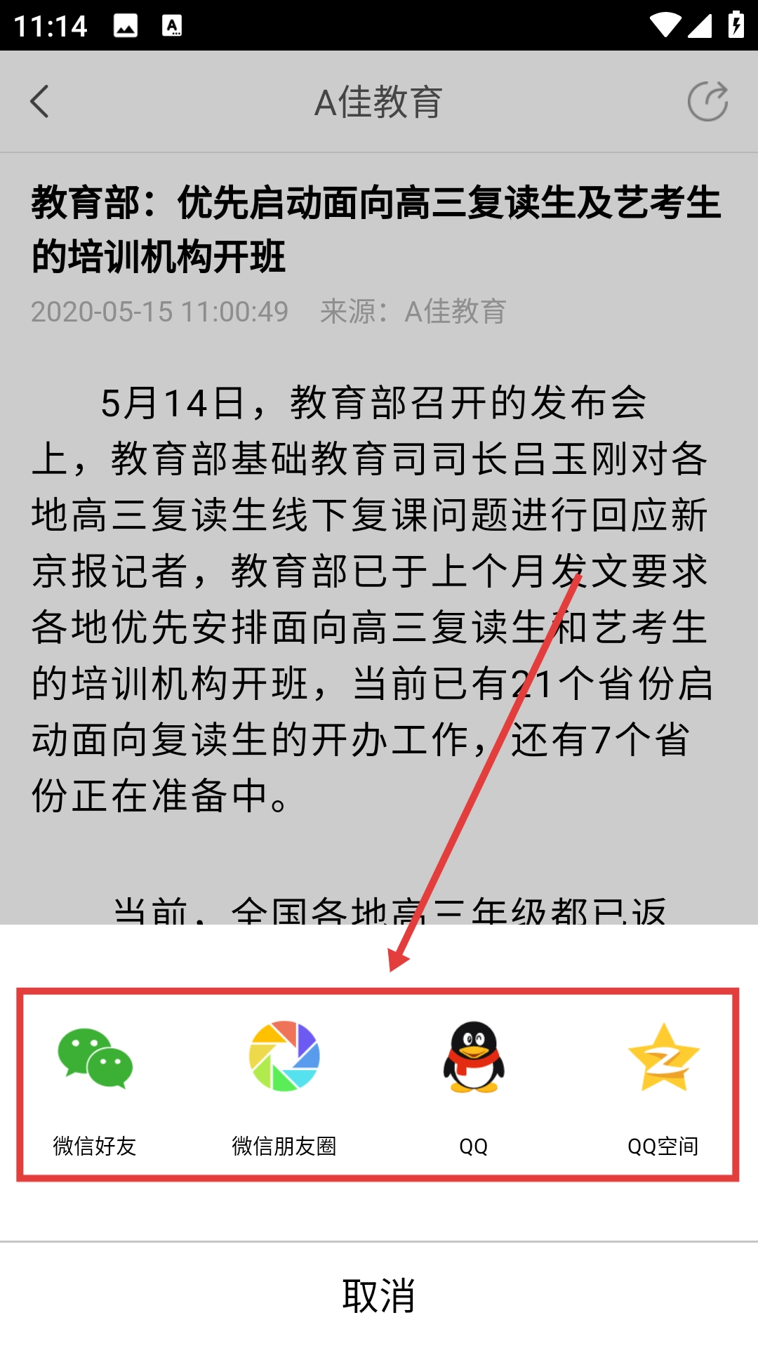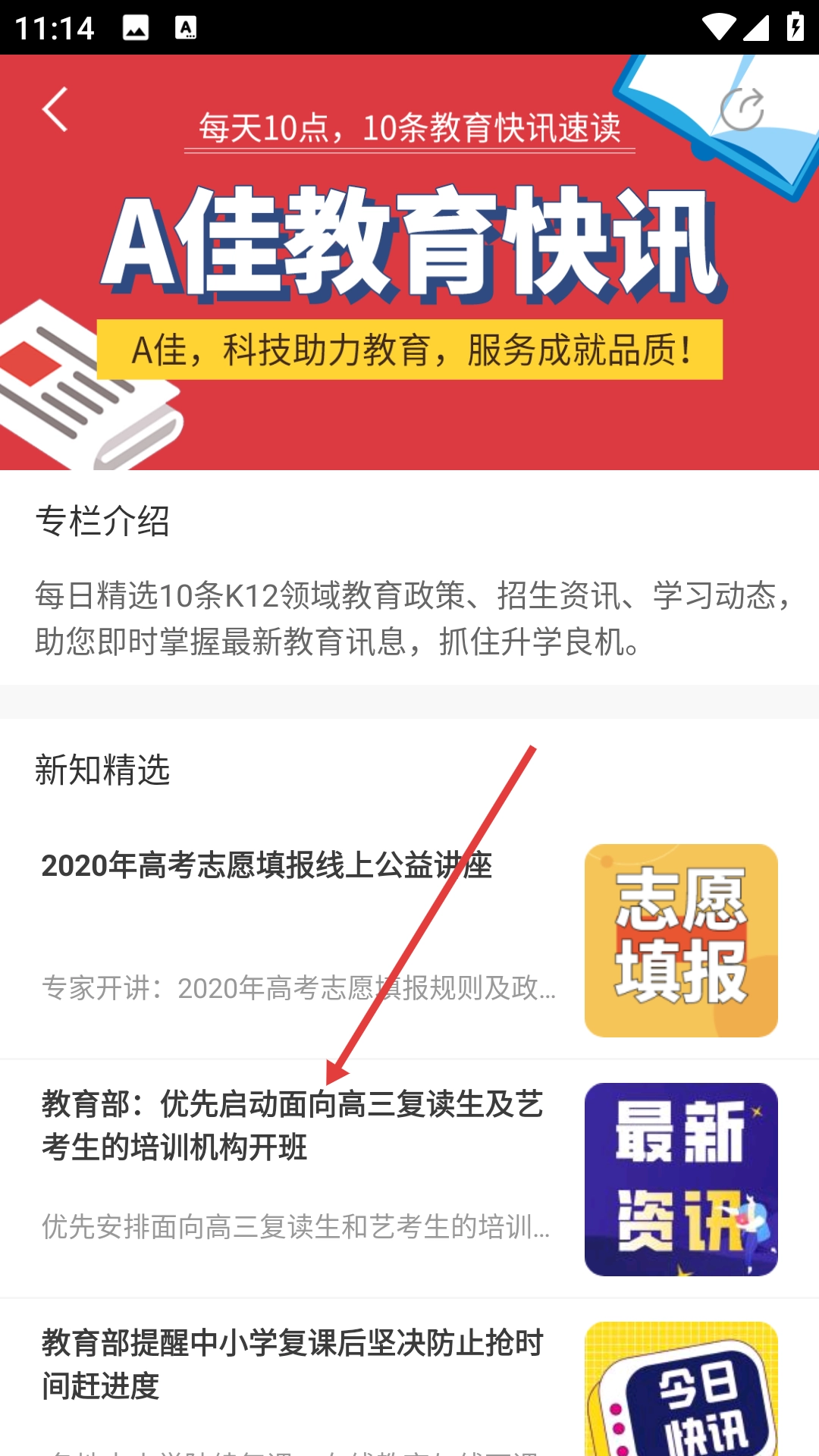 在A佳教育快讯页面,找到并点击想要查看的新闻(例如“教育部:优先启动面向高三复读生及艺考生的培训机构开班”这一新闻),即可进入该新闻的详情页面。