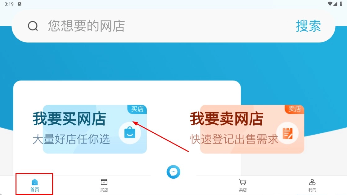 在首页找到并点击【我要买网店】功能板块,即可进入买店页面。