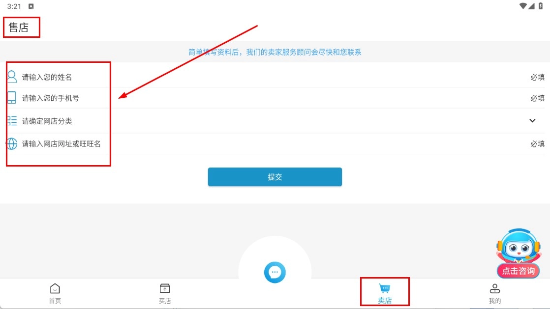 点击底部的【卖店】功能按钮,即可进入售店页面,按要求填写姓名、手机号等必要信息后提交即可。