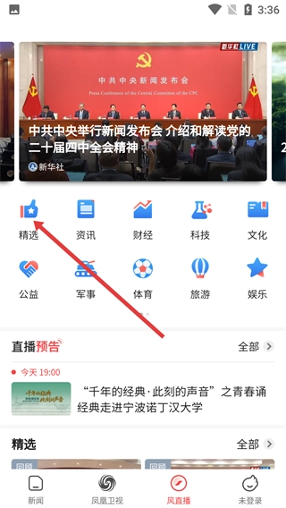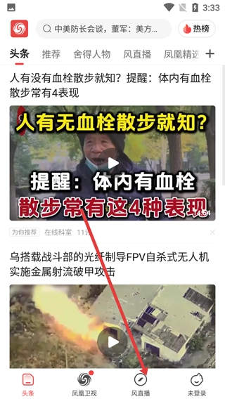 打开软件进入首页后,点击底部的【风直播】按钮,就能进入直播板块,查看并浏览各类直播内容。