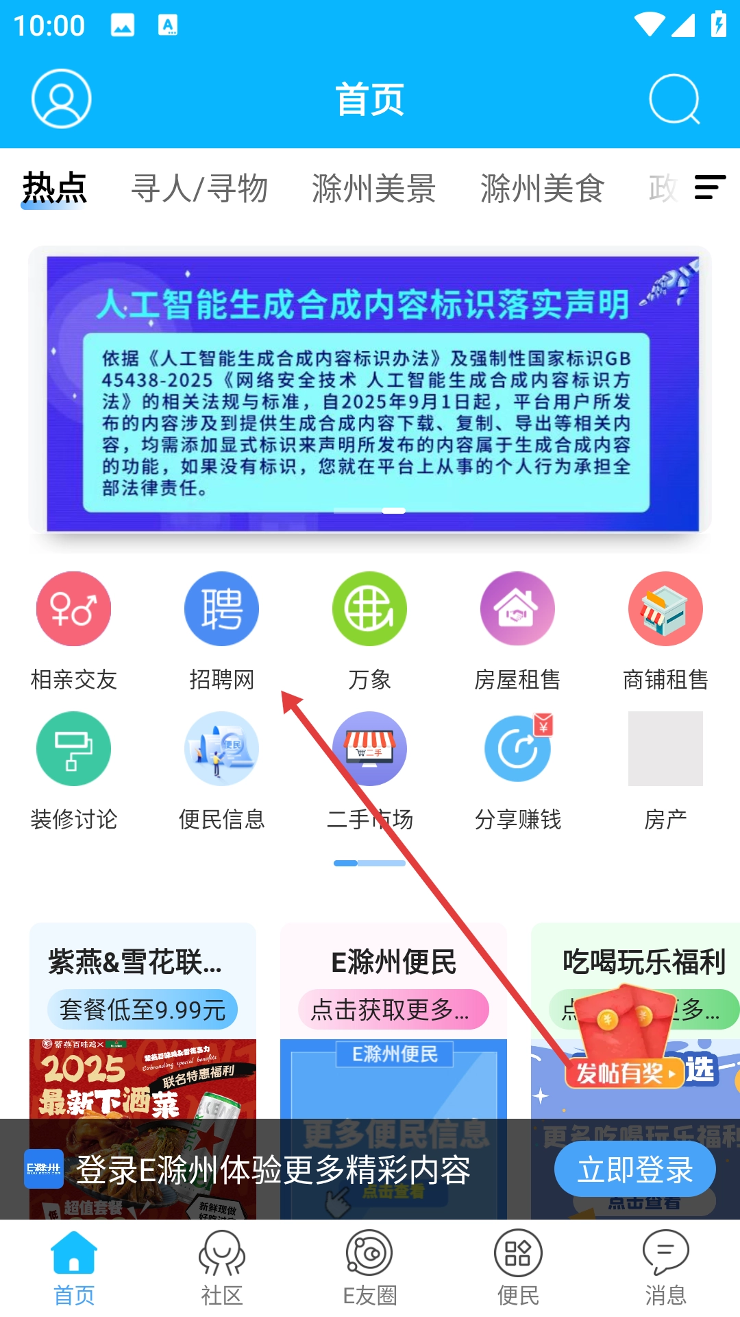 在E滁州首页找到并点击【招聘网】选项,即可进入E滁州招聘网的页面。
