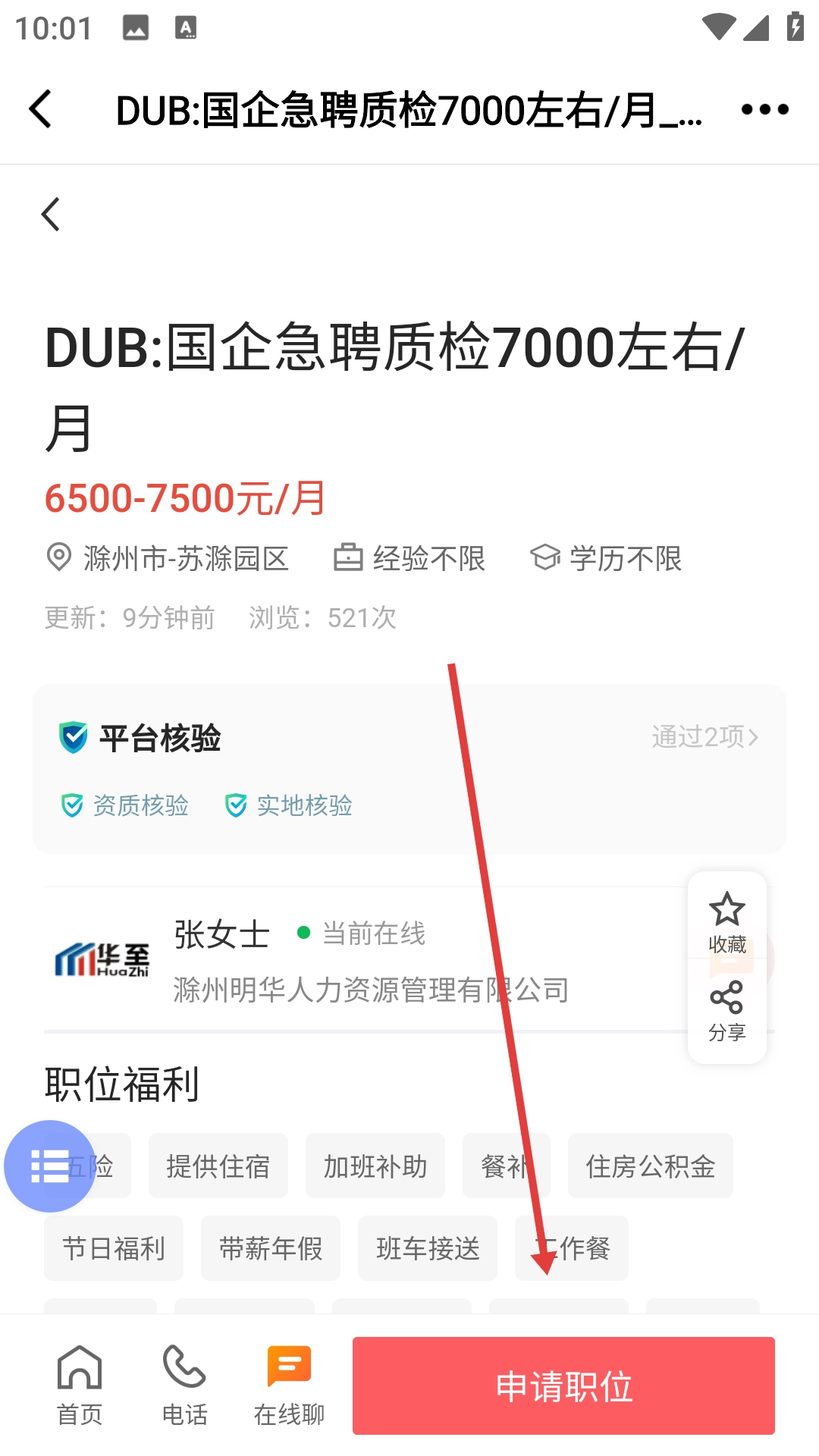 在职位列表页面挑选目标岗位(例如DUB:国企急聘质检7000左右/月),然后进入该岗位的详情页面。