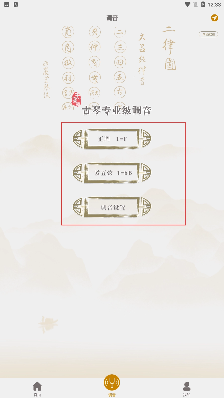 在调音页面,您可以选择【正调1=F】【紧五弦1=bB】这两个选项,或者点击【调音设置-功能选项】进行操作。