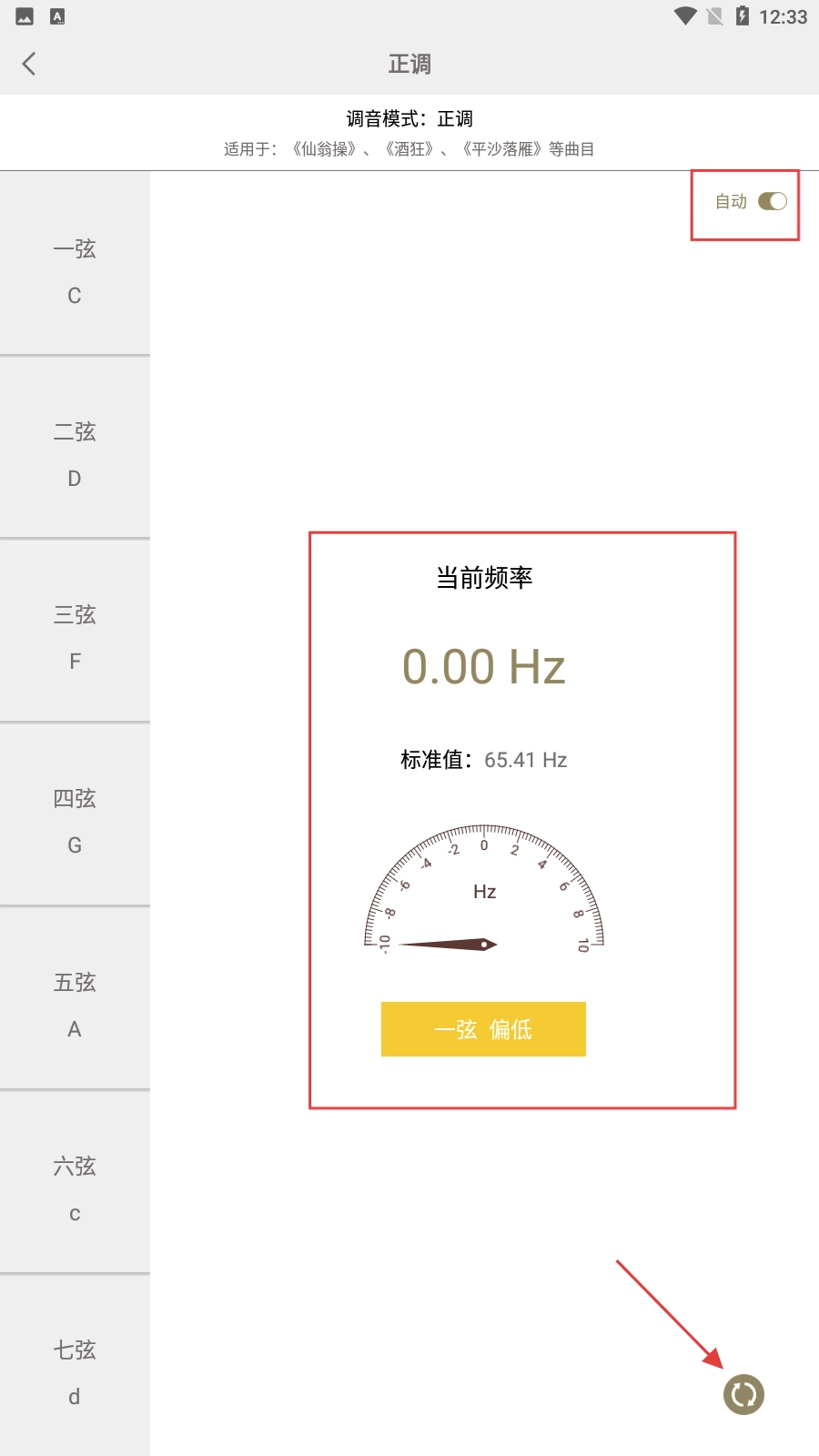 进入正调页面后,能查看每根弦的频率,还可以通过点击自动开关与刷新按钮来执行相关操作。