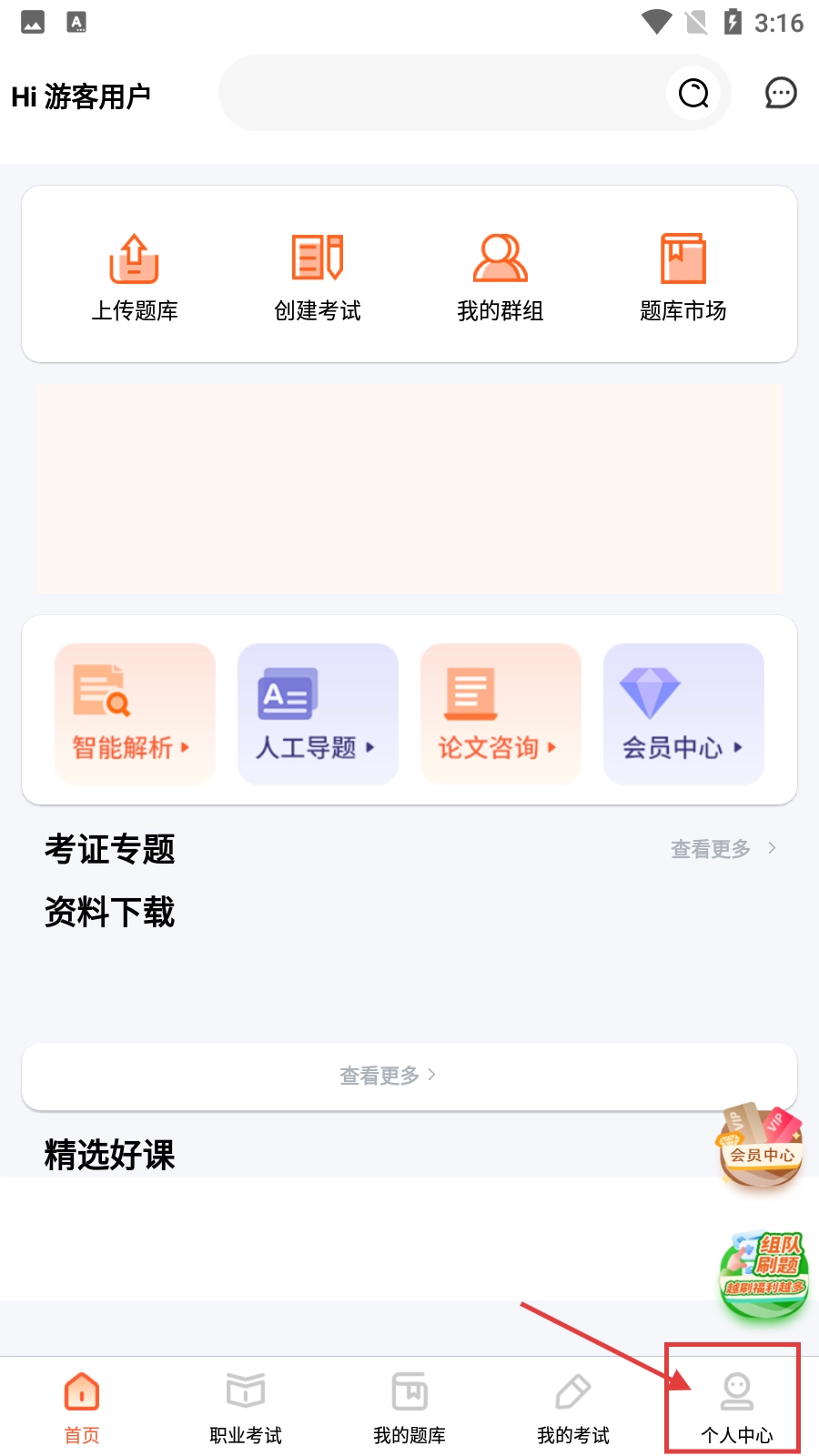 在首页,点击右下角的【个人中心】按钮,即可进入个人中心界面。