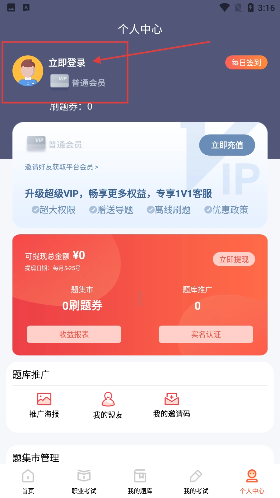 在个人中心页面,点击【立即登录】按钮,即可跳转至登录注册界面。