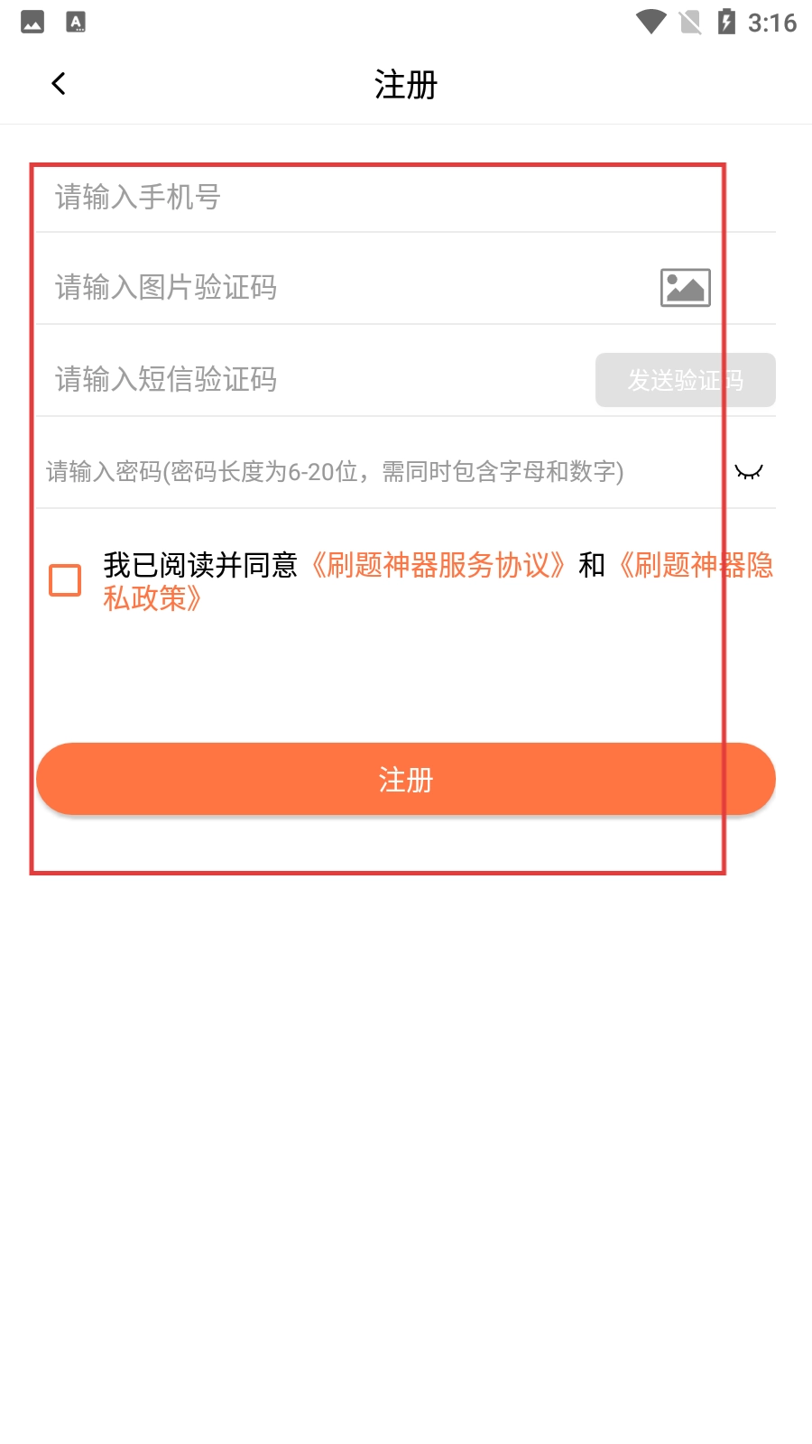 在注册页面,按顺序填写手机号、图片验证码、短信验证码,并设置由字母和数字组成的6至20位密码。